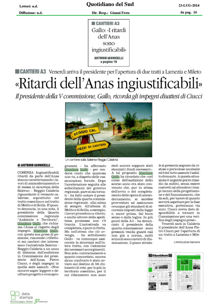 Anas / Gallo: “I ritardi sono ingiustificabili” / Il Quotidiano del Sud